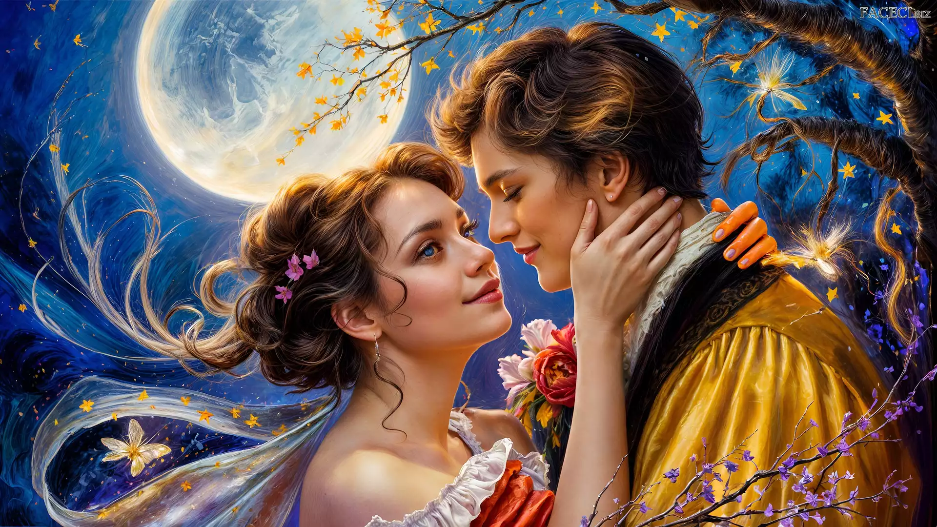 Pełnia. Grafika, Zakochani, Kobieta, Mężczyzna, Drzewo, Księżyc - faceci.biz
